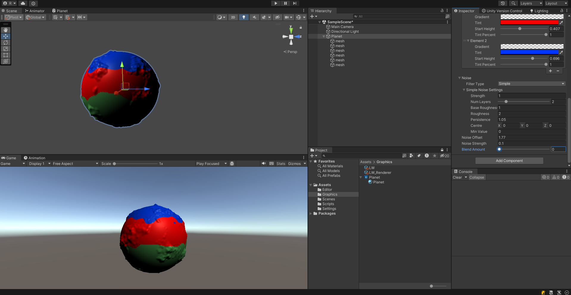 BiomePercentFromPoint로 pointOnUnitSphere, 즉 행성을 이루고 있는 정점들이 어떠한 생물 군계에 있는지 계산해서 해당 정보를 저장하고, UV 채널을 사용하여 셰이더의 색상을 그리도록 기능을 구현한다.
