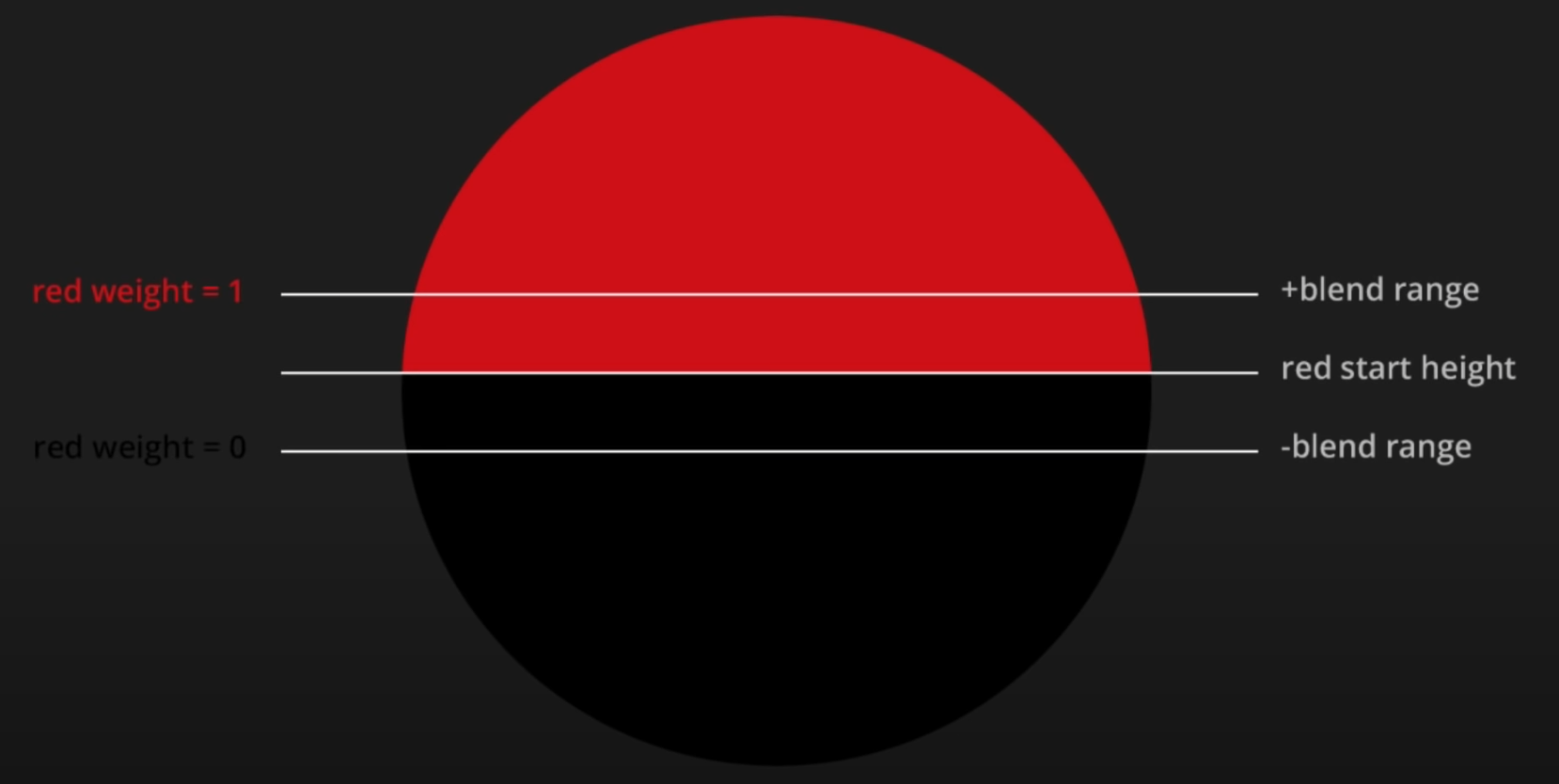 blend range 만큼의 blend 범위를 잡아주고 가중치 weight를 blend range의 범위에 맞게 0 ~ 1까지 설정한 후에 색상이 해당 숫자의 비율만큼 혼합되도록 한다.