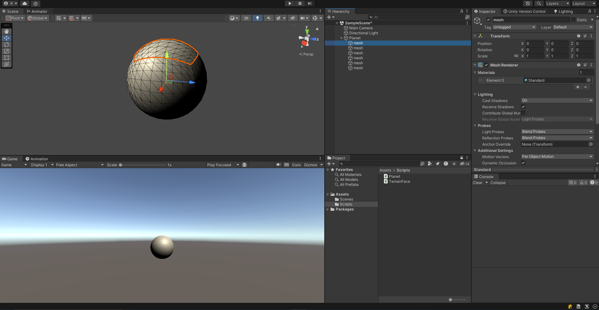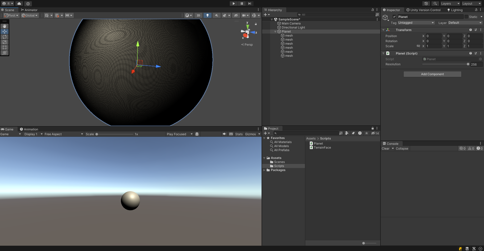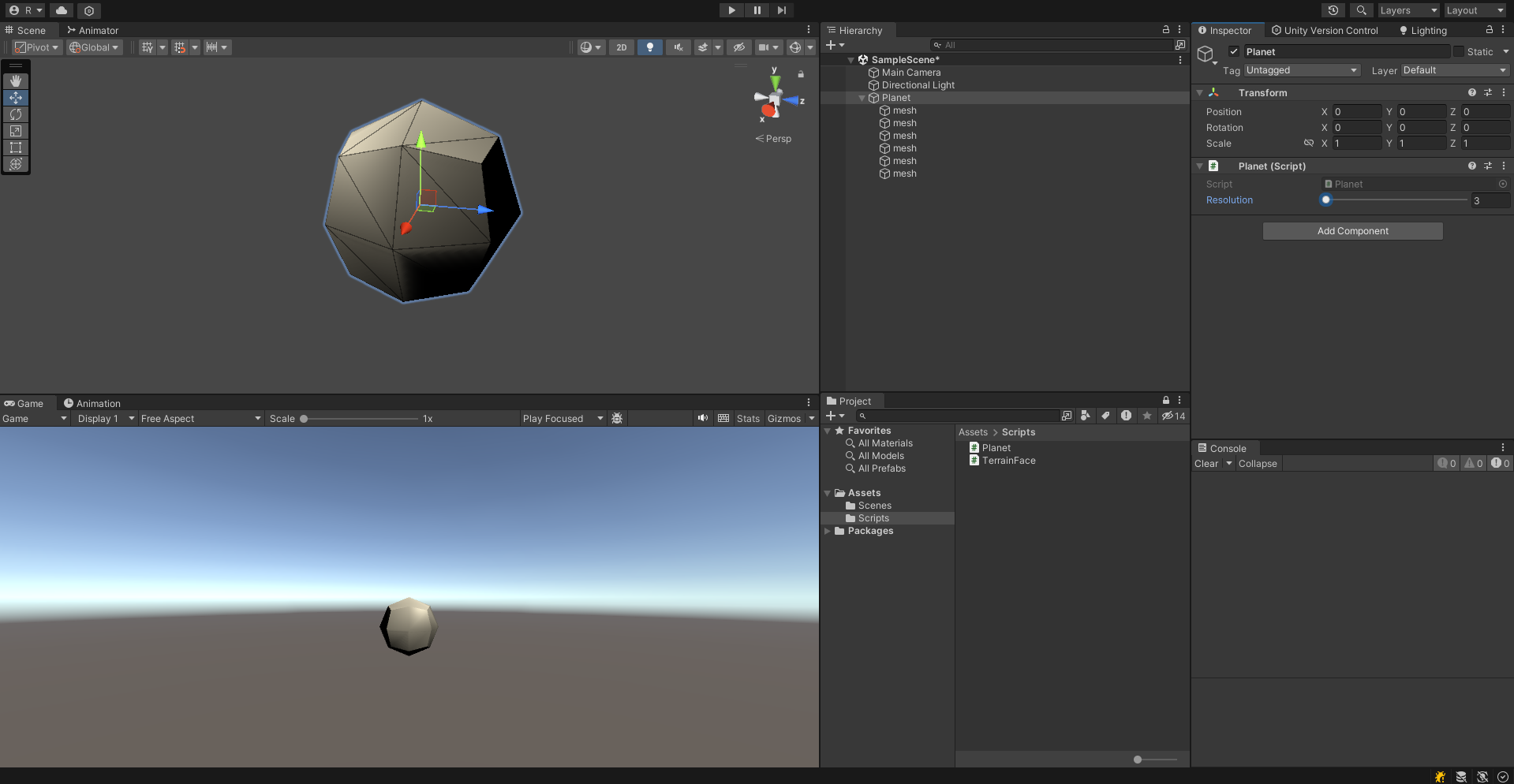 Planet과 TerrainFace라는 스크립트를 생성해준다. Planet은 실제로 우리가 만들게 될 행성을 담당하는 스크립트이고 TerrainFace는 해당 행성의 지표면을 책임질 스크립트이다.