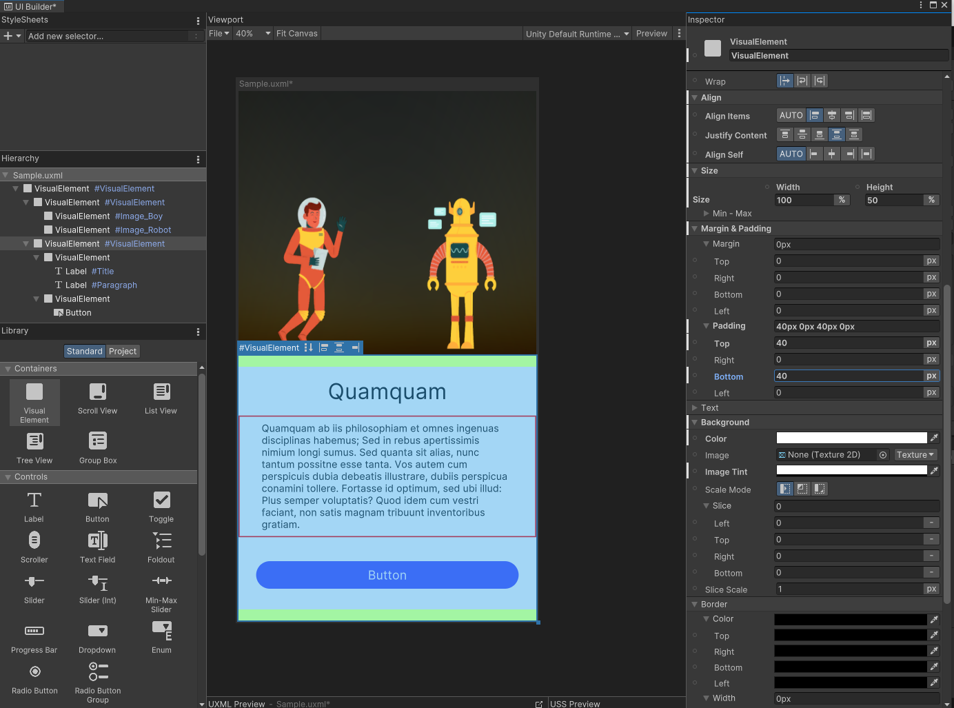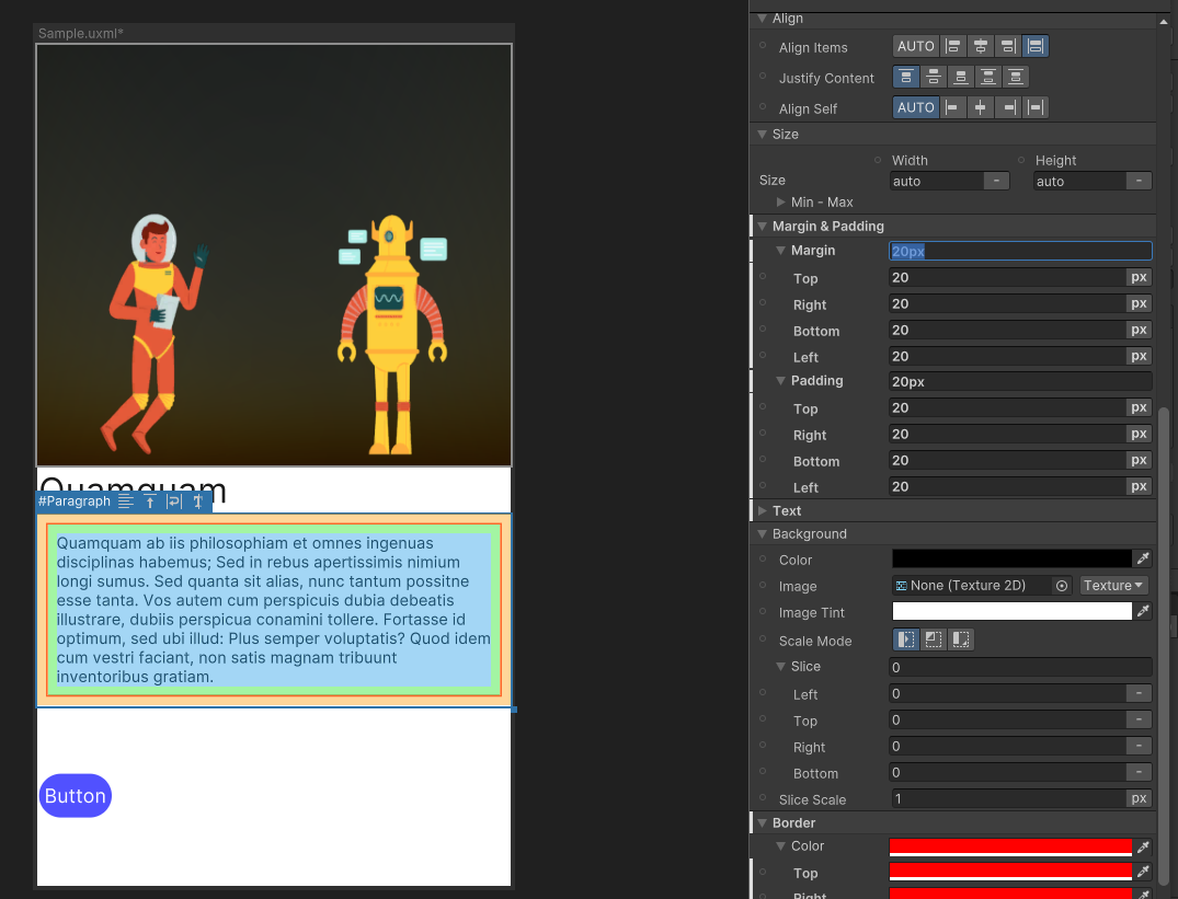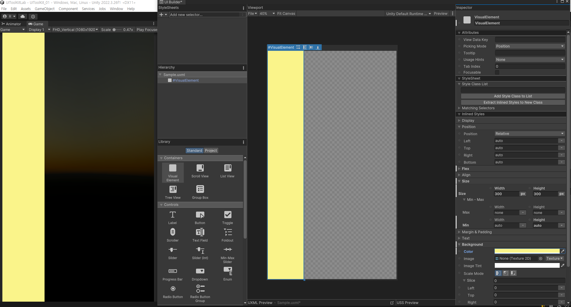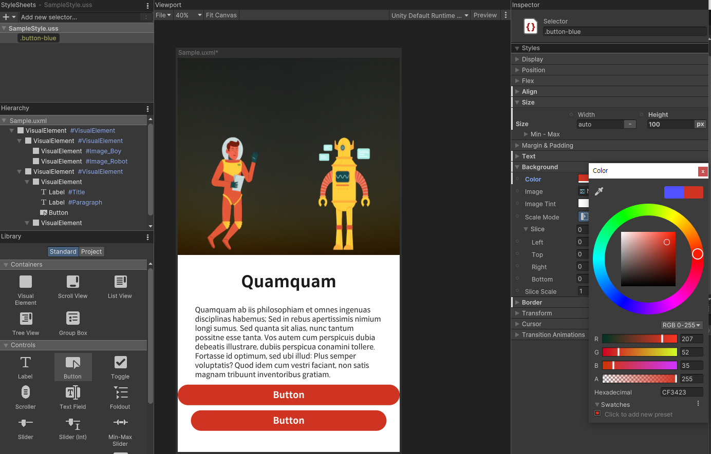 우측의 인스펙터를 통해 Visual Element의 크기, 색상 같은 스타일을 설정해 줄 수 있다.