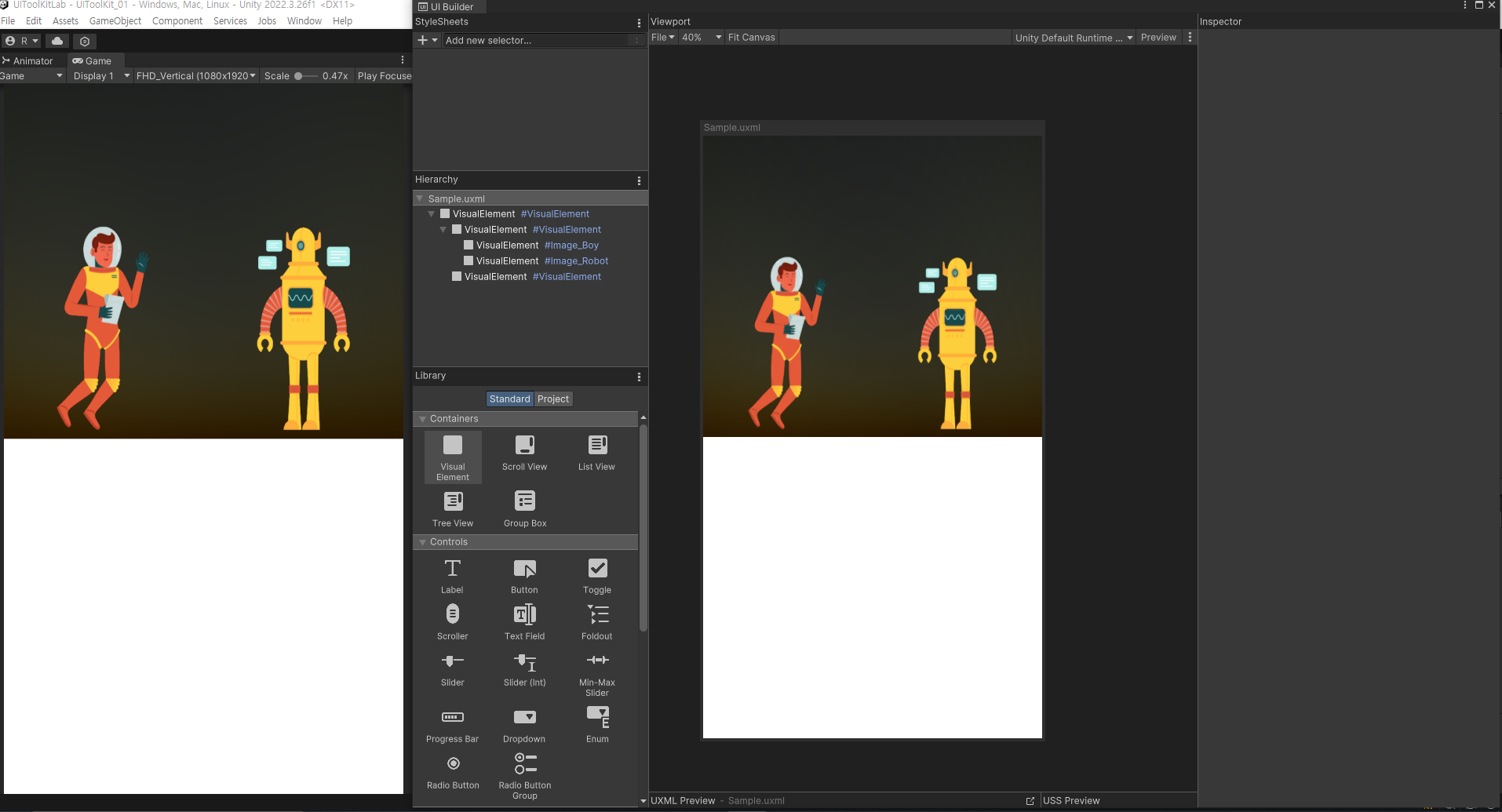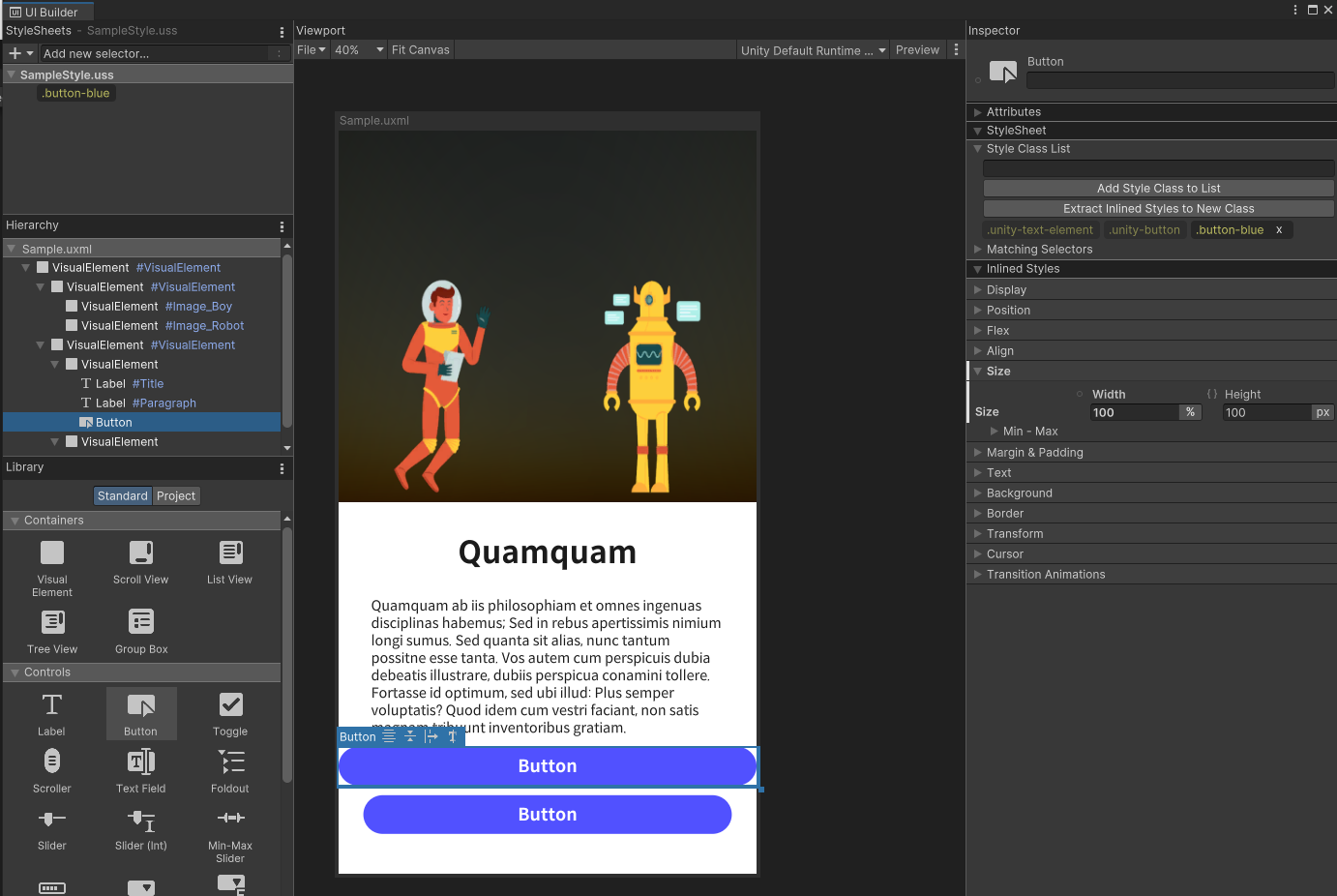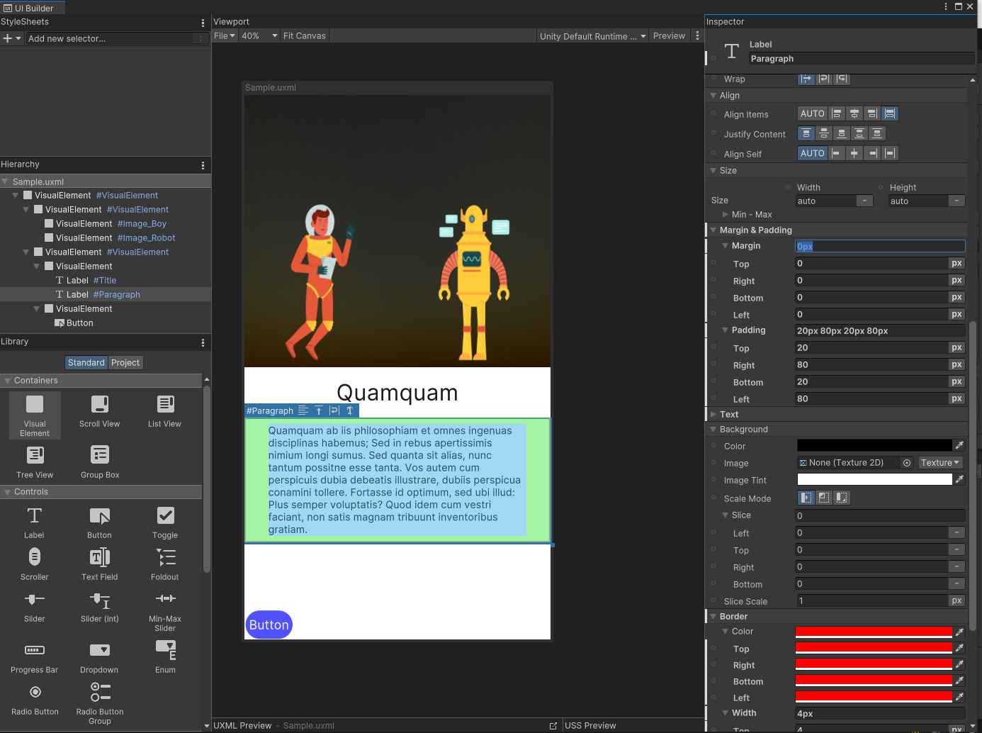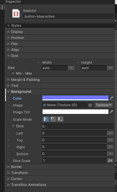 우측의 인스펙터를 통해 Visual Element의 크기, 색상 같은 스타일을 설정해 줄 수 있다.