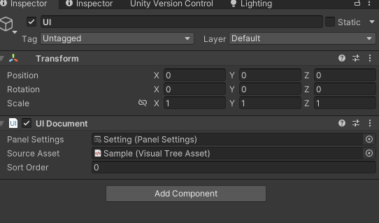 빈 오브젝트를 하나 만들고 UI Document 컴포넌트를 추가해주고 uxml 파일을 연결해준다.