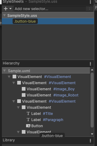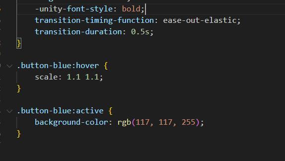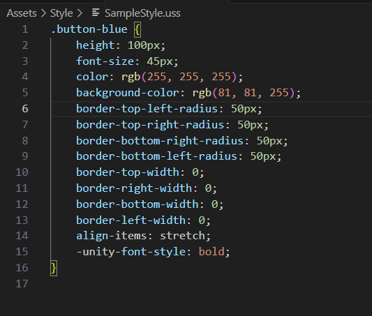 그리고 uss 파일 안에 스타일 클래스가 추가되었다. 이후에 uxml과 uss 파일을 VScode로 열어보면 uxml의 <ui:Button>에 스타일 클래스의 이름만 적혀있고 uss에는 button-blue 스타일 클래스에 대한 정보가 들어있다.