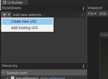 그럼 스타일 시트는 어떻게 만들고 사용할까? 먼저 UI Builder의 좌측 상단의 + 버튼으로 Style Sheet (USS)를 만들 수 있다.