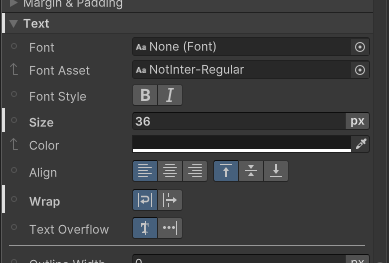 Panel Settings에서 전체 Font를 관리할 수 있는데, Font 설정 파일을 추가로 만들어야해서 간단히 UI Builder에서 적용하도록 해보자. 단순히 Label을 고른다음의 Inspector의 Text의 Font Asset에서 설정해주면 된다.