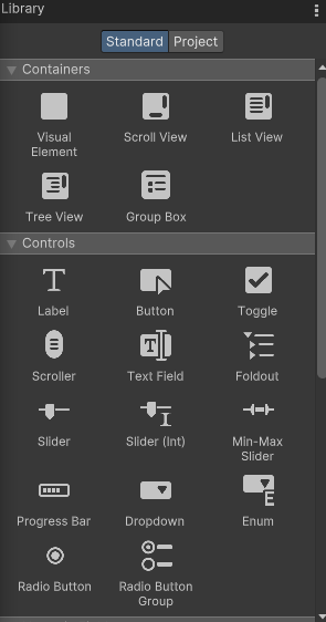 먼저 Library > Containers > VisualElement 끌어다 놓는다. VisualElement는 UI Tool Kit에서 가장 기본이 되는 구성요소로 UGUI의 게임 오브젝트와 이미지를 담당해주는 요소라고 생각하면 된다. (hrml의 <div> 태그를 담당하는 역할을 한다.)