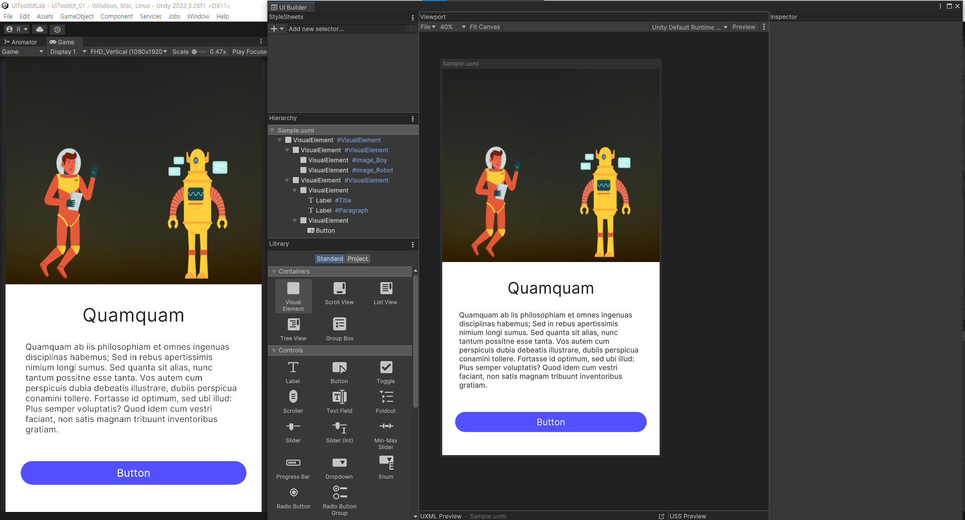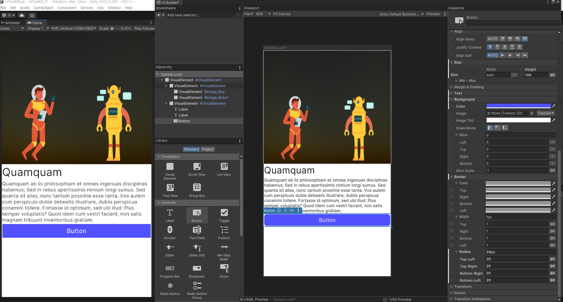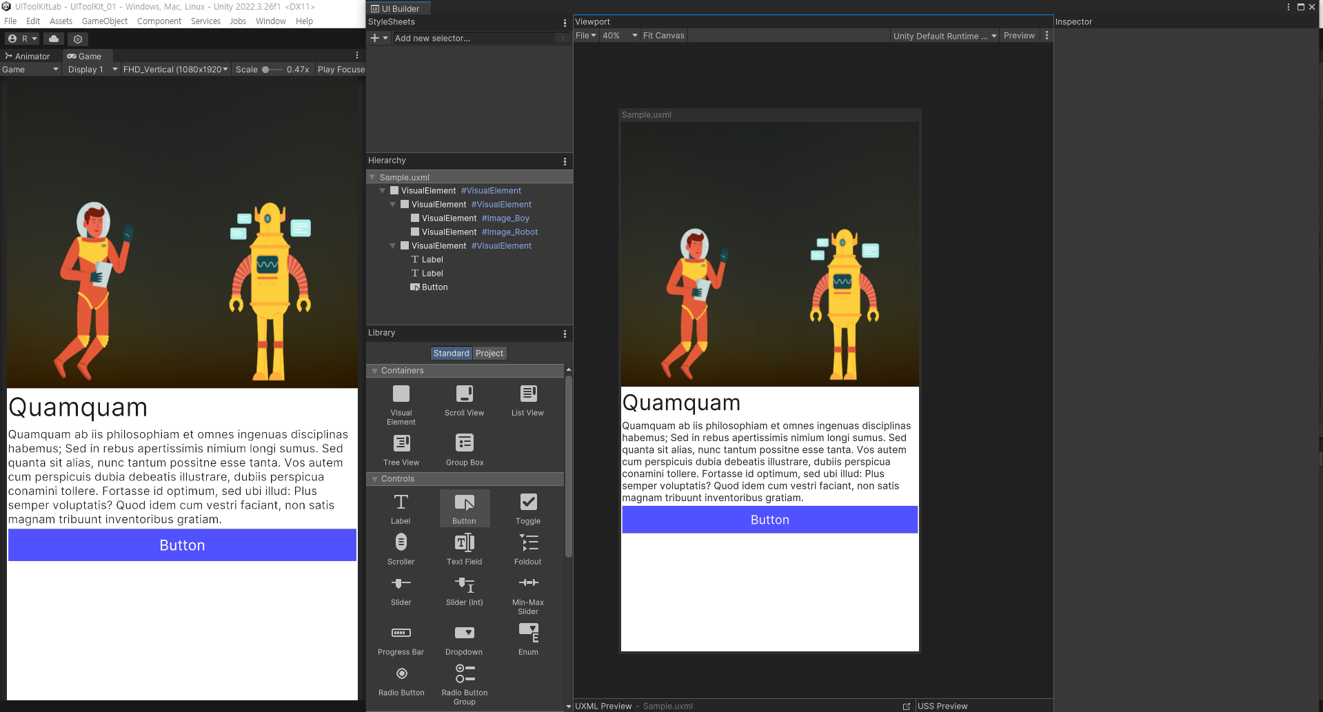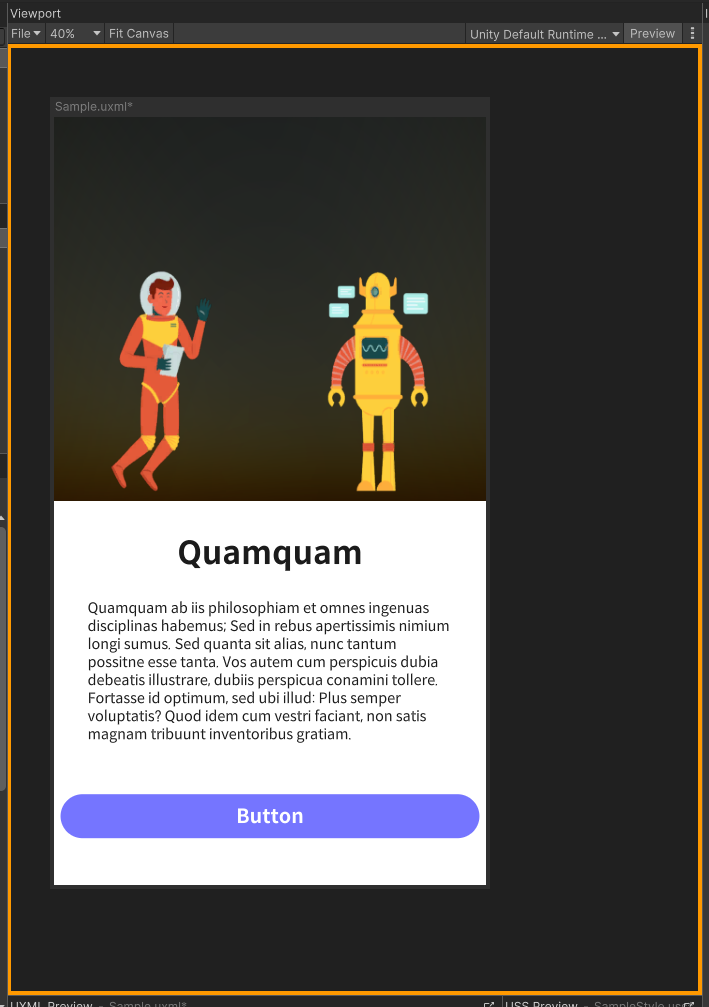 실행해보면 알겠지만 UI는 정상 출력이 되도 어떤 기능적인 부분은 하나도 없다. 버튼에 이벤트에 반응하도록 하면서 Unity UI의 스타일과 스타일 시트에 대해서 알아보자.