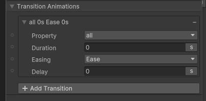 좌측 상단의 클래스 시트에서 기본 셀렉터를 선택하고 인스펙터 맨 밑의 Transition Animation에서 변환 애니메이션을 줄 수 있다.