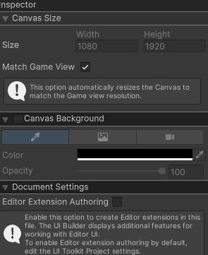 뷰포트의 uxml을 선택하고 인스펙터의 Canvas Size에서 Match Game View를 선택하면 게임 뷰에서 지정한 사이즈로 커진다.