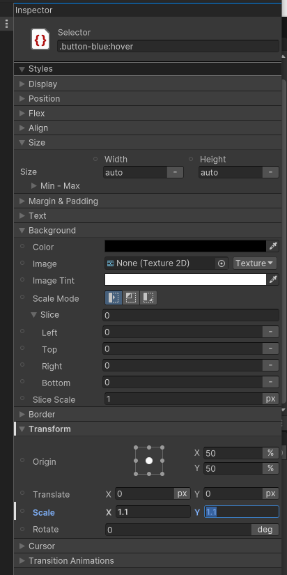 이제 새롭게 추가된 셀렉터를 선택하고 인스펙터에서 어떠한 변화를 줄지 만들어줄 수 있다. 아래와 같은 변화를 주었다.