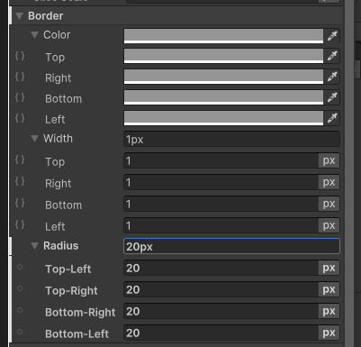 놀랍게도 별도의 텍스쳐가 필요했던 기존과는 달리 UI Tool Kit은 모서리가 둥근, 라운드 버튼을 쉽게 만들 수 있다. Border의 Radius를 20으로 하면 반지름이 20px인 원으로 모서리를 처리하겠다는 뜻이다.
