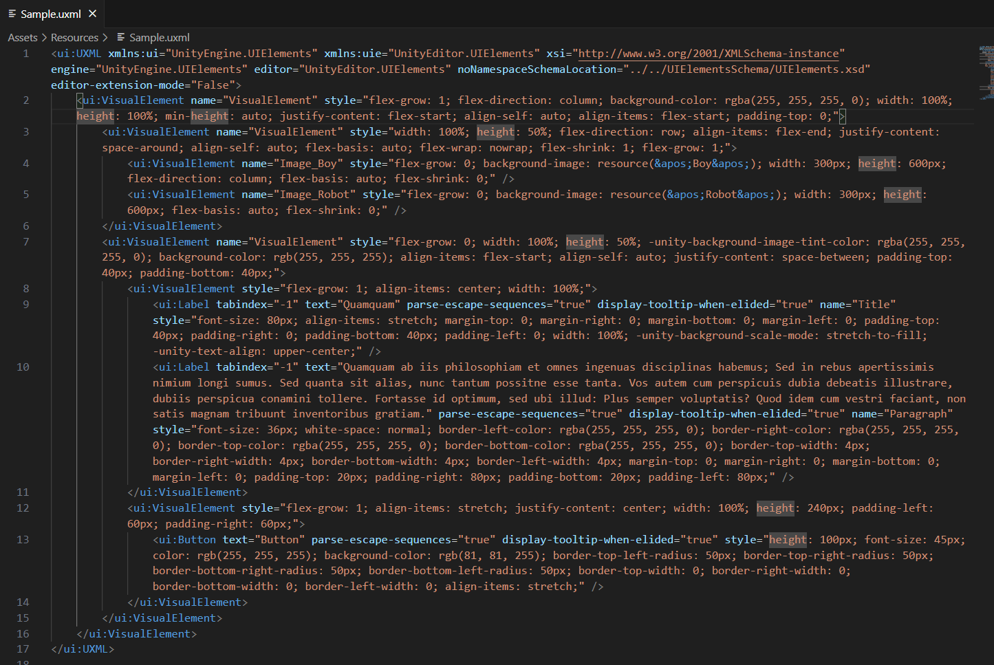 변화된 값과 속성들에 대한 정보는 uxml 파일 안에 UI 구조 레이아웃 정보와 함께 저장된다. 아래는 실제 uxml 파일의 내부 내용이다.