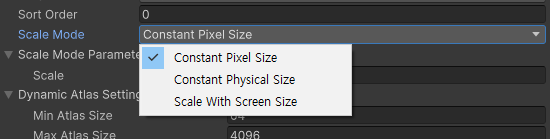 패널 전체에 적용할 테마나 텍스트 설정을 해줄 수 있는데, 대부분은 기본 설정을 사용해도 되는데, Scale Mode는 확인하고 넘어가자. Scale Mode는 Canvas에 붙어있던 Canvas Scaler라고 보면 된다. 해상도를 고정해서 다룰 것이기 때문에, Constant Pixel Size를 설정한다.
