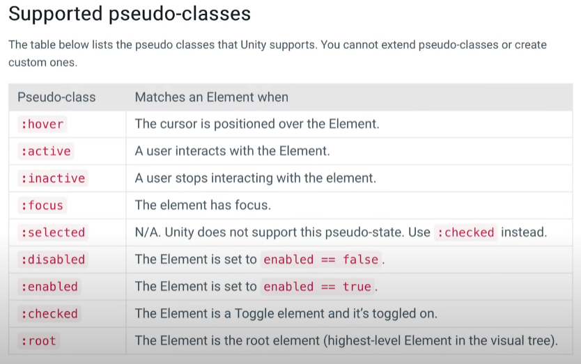 유니티가 제공하는 Pseudo 클래스로 버튼이 이벤트에 반응하도록 해보자. 스타일 클래스와 Pseudo 클래스의 차이는 아래와 같다.