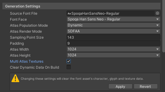 이렇게 해야 UI Builder에서 Bold 옵션을 선택했을때 잘 적용된다. 그 다음 Regular와 Bold Asset 모두 Generation Settings에서 Atlas Population Mode를 Dynamic으로 바꿔주고 Apply 해준다.