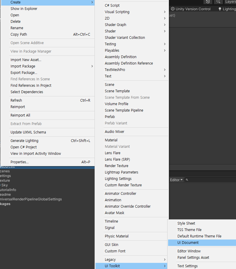 레이아웃과 구조를 담당한 uxml 파일을 하나 만든다. Create > UI ToolKit > UI Document