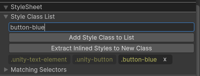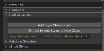 좌측의 uss에서 스타일 클래스를 하이어라키 창의 UI 요소에 드래그해서 넣어주거나 Style Class에 직접 이름을 입력해서 Add Style Class to List 버튼을 눌러서 추가할 수도 있다.