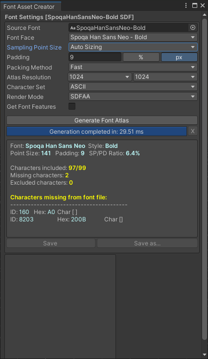 글꼴을 적용해보자. Window > text > Font Asset Creator로 간다. 글꼴을 Source Font에 끌어다 놓고 Generate Font Atlas를 눌러 Font Asset을 만들어준다.