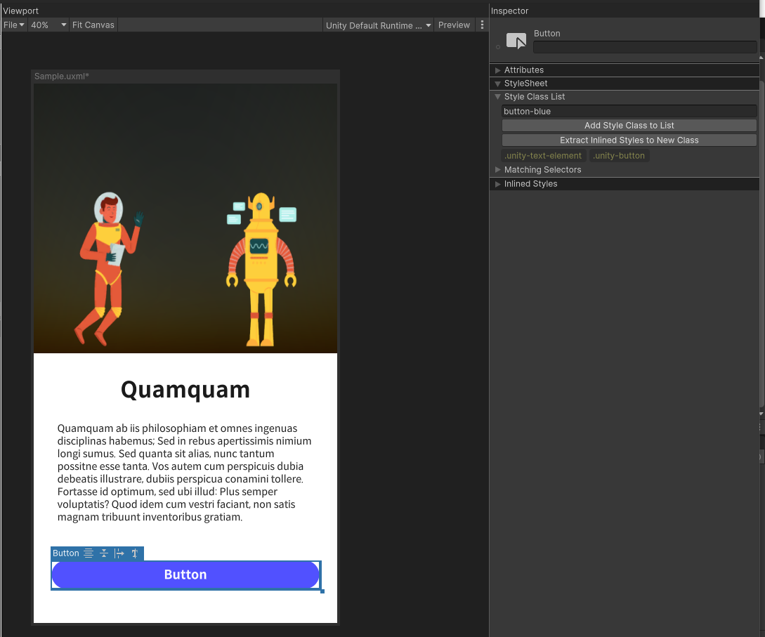 이러한 인라인 스타일은 바로바로 직접 스타일 적용이 가능하고, UXML 안에 별도로 저장되는 장점이 있지만 규모가 커지면 관리가 어렵다는 단점이 있다.