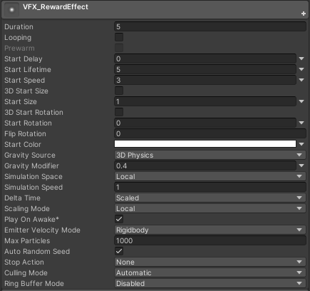 Max Particles : 최대 파티클의 수, 한도에 도달하면 파티클 일부가 제거된다. (수치에 따른 양 조절에 사용해도 좋을 것 같다.)