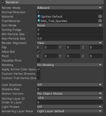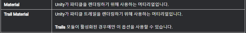 Material과 Trail Material로 파티클의 Material과 파티클 Trail을 렌더링하기 위해 사용하는 Material을 지정해줄 수 있다.