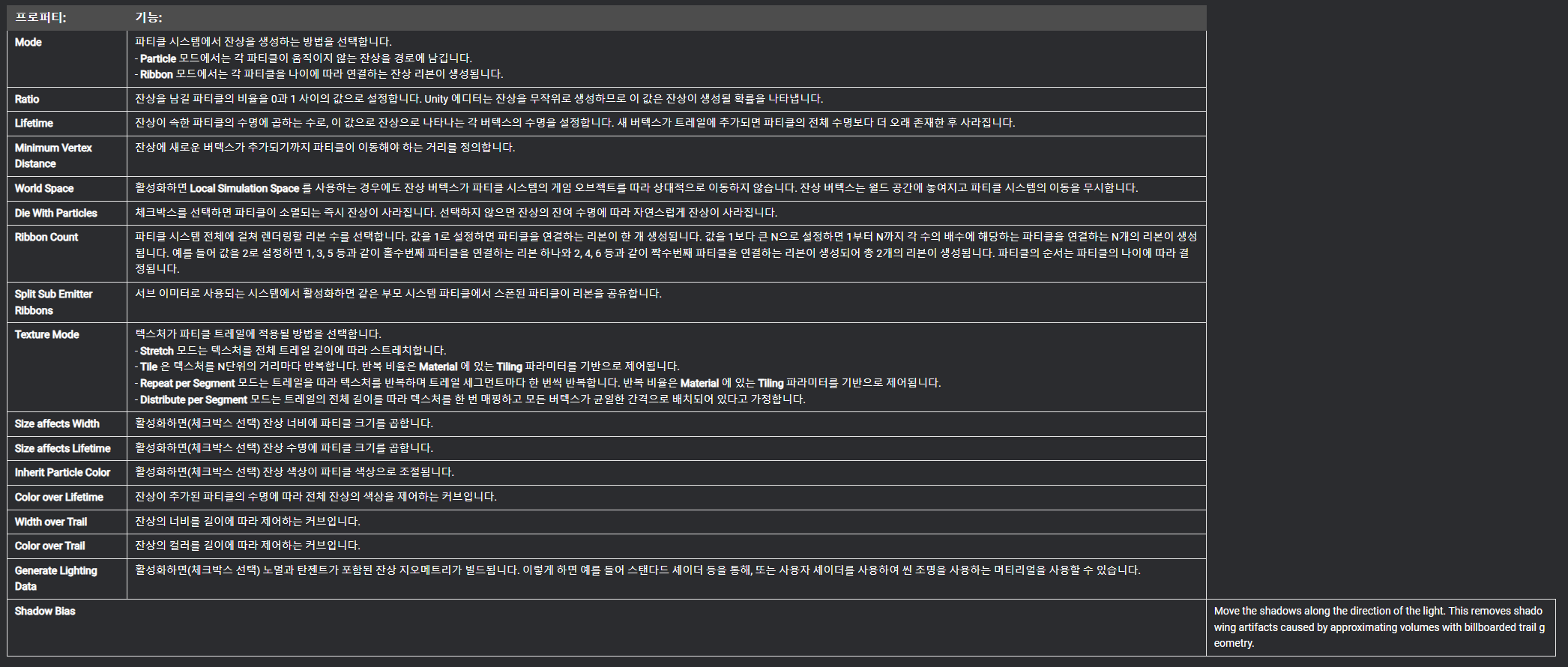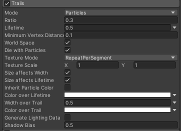 파티클에 잔상을 추가할 수 있다. Trail Renderer 컴포넌트와 많은 프로퍼티를 공유하지만, 잔상을 파티클에 쉽게 연결하고 파티클의 다양한 프로퍼티를 상속할 수 있는 기능을 제공한다.