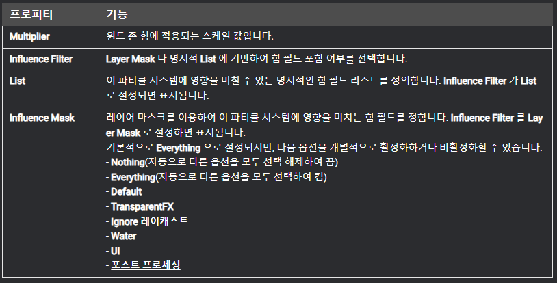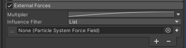 외부 힘 모듈은 유니티 공식 문서 설명으로는 wind zones와 Particle System Force Field의 영향을 받는다고 한다.