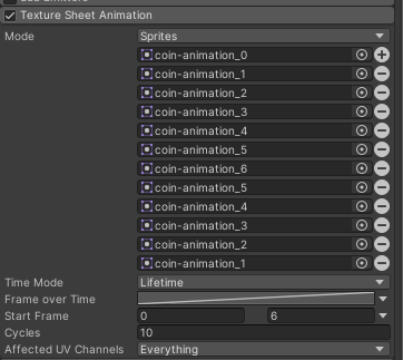 Time Mode는 파티클의 생명 주기(Life Time)이고, 생명주기 동안 어떻게 프레임을 구성할 것인지를 그래프로 설정해놨다. 12프레임을 아래와 같은 직선 그래프로 설정해놨다, 즉 생명주기 동안 한 사이클에 12장의 스프라이트가 순서대로 진행되서 반복되는 방식이다.