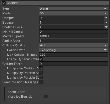 Collision을 활성화해줘야 파티클과 게임 오브젝트의 충돌을 제어할 수 있다. 이때 World 모듈 프로퍼티를 쓴다. (Planes Moduel Properties는 충돌 평면을 정의할 때 사용한다.)