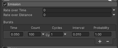 파티클을 한번에 Bursts로 생성되는데 0.05초에 100개를 생성해낸다. 1번만 반복하고 0.01초 만에 Burst 한다.