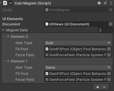 CoinMagnet에 m_MagnetData로 MagnetData가 리스트 형식으로 저장되어있고 여기서 연결된 Force Field를 찾아온다. 동일한 ItemType의 MagnetData를 가져와서 ForceField를 반환해주는 방식!