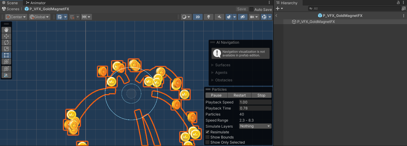 일단 해당 UI 로직이 어디서 실행되는지를 살펴보자. 해당 버튼을 누르면 P_VFS_GoldMagnetFX 라는 파티클 시스템이 Clone으로 복사 생성된다! 파티클로 동전이 생성된다.