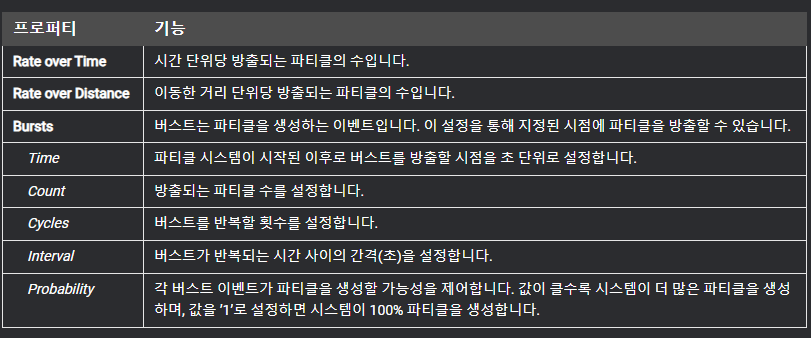 Emitter Velocity Mode : 파티클 시스템이 Inherit Velocity 모듈과 Emission 모듈에 사용할 속도를 계산하는 방법을 선택한다. 시스템은 Rigidbody 컴포넌트(있을 때에 한함)를 사용하거나 Transform 컴포넌트의 움직임을 추적하여 속도를 계산할 수 있다.