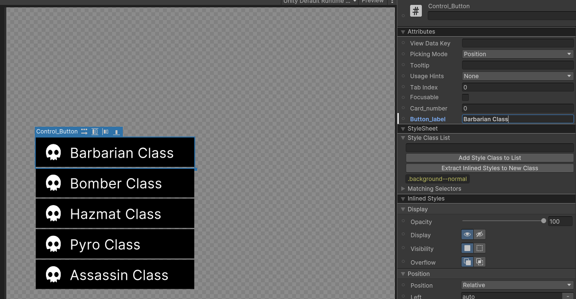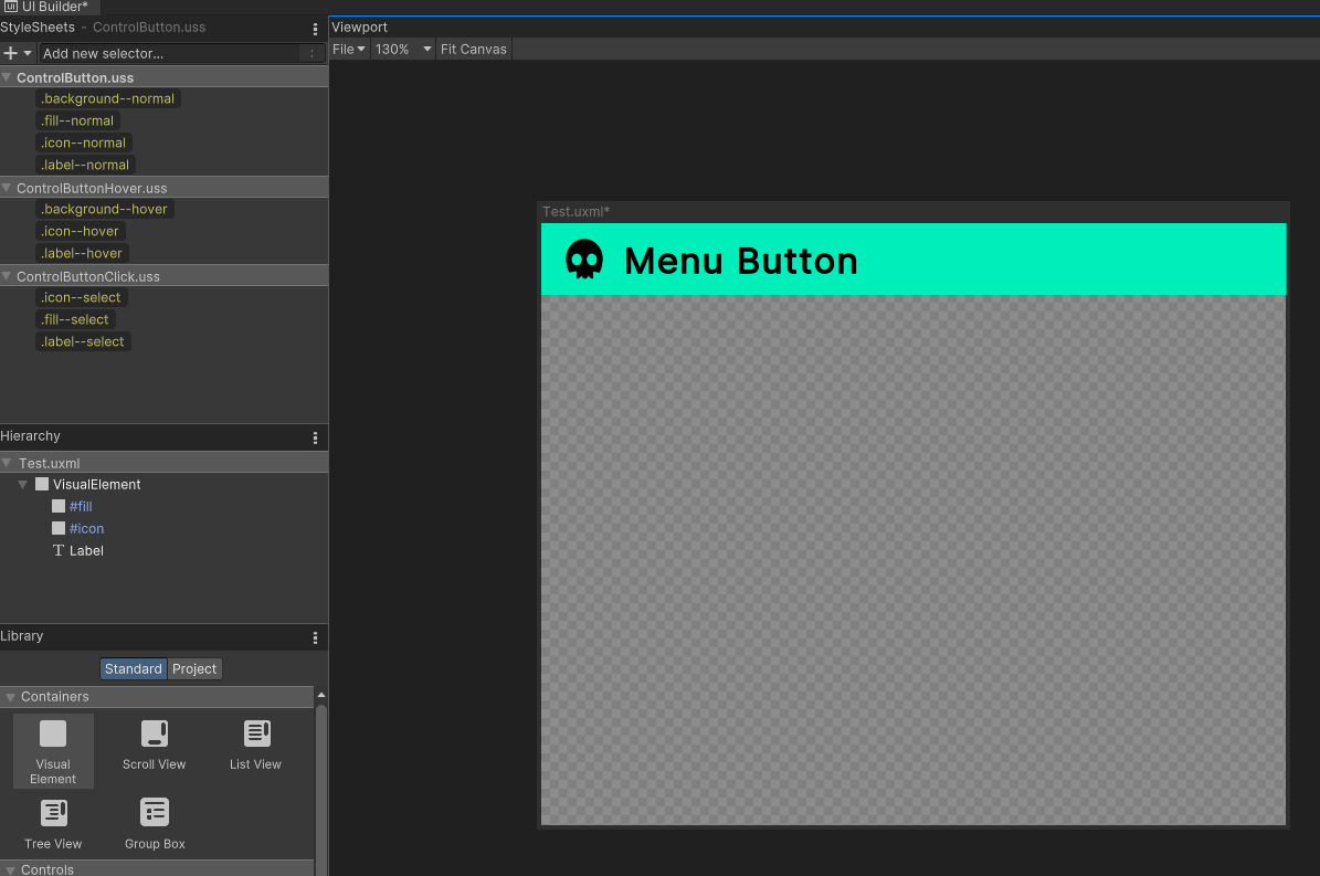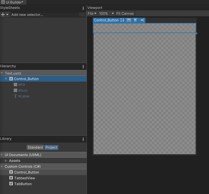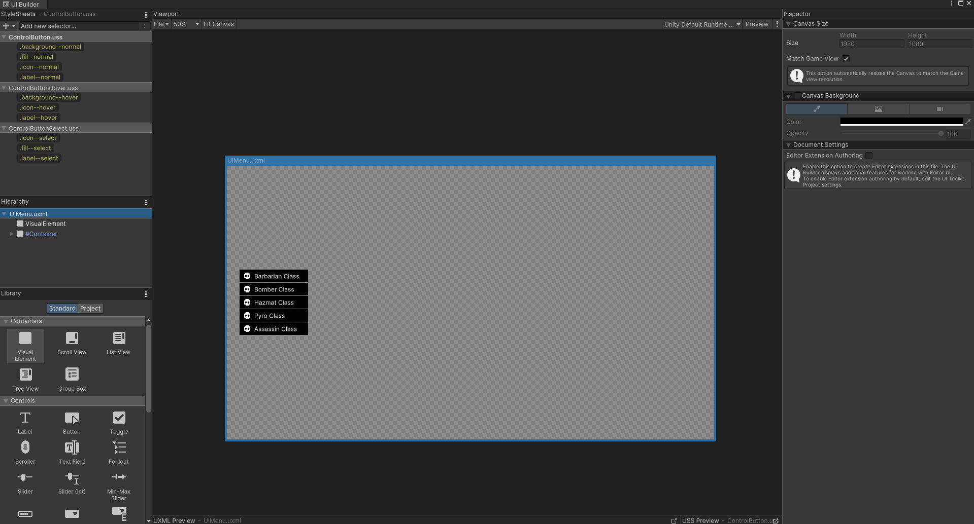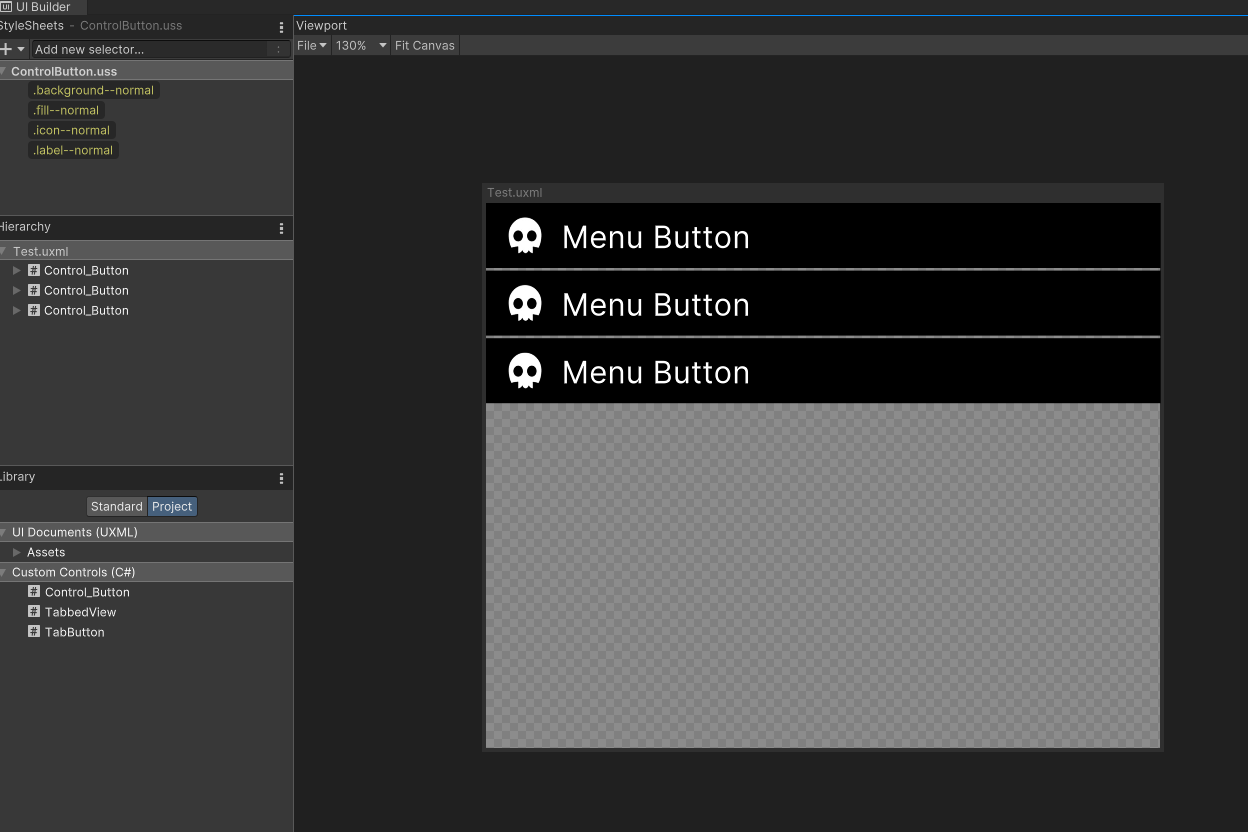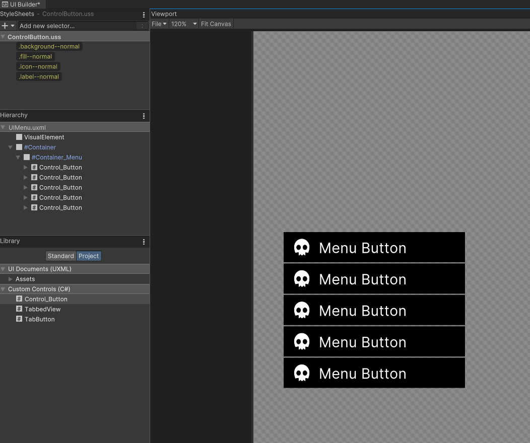 먼저 커스텀 메뉴를 만들기 위해서 UXML 및 UI 빌더에 커스텀 컨트롤 노출 문서를 참고해서 아래와 같이 커스텀 컨트롤 버튼을 만들어주었다.
