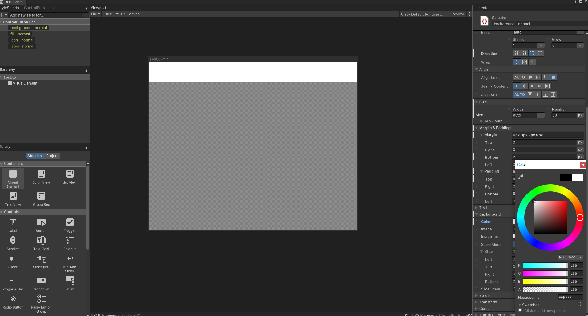 VisualElement를 하나 만든 다음에 background--normal 스타일 클래스를 적용시켜 준 다음 이제 background Color를 다시 흰색으로 바꾼다. 그 다음에 스타일 클래스를 저장해준다.