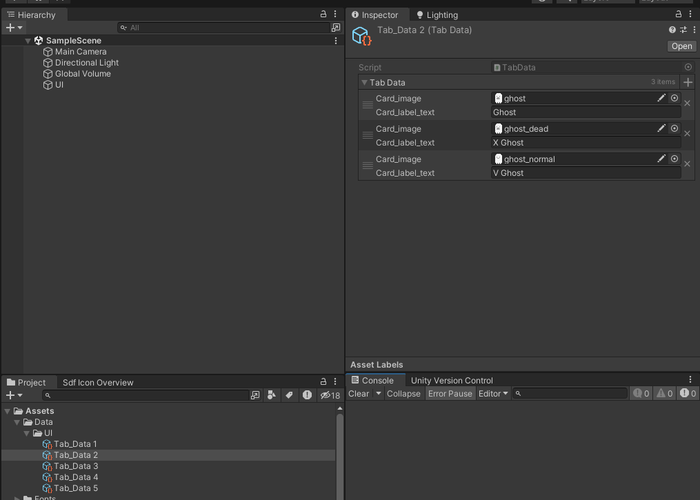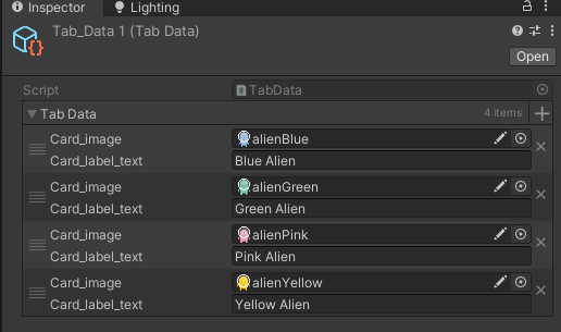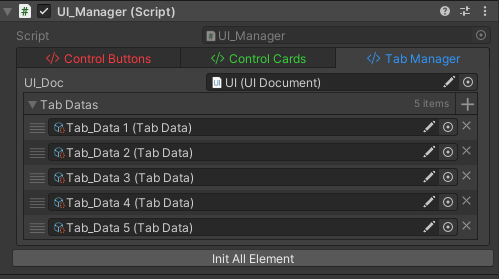 이제 TabData를 탭 메뉴 개수만큼 만들어준 후에 인스펙터로 초기화해준다.