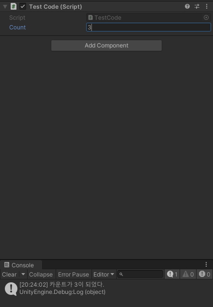 Debug.Log("카운트가 3이 되었다.");