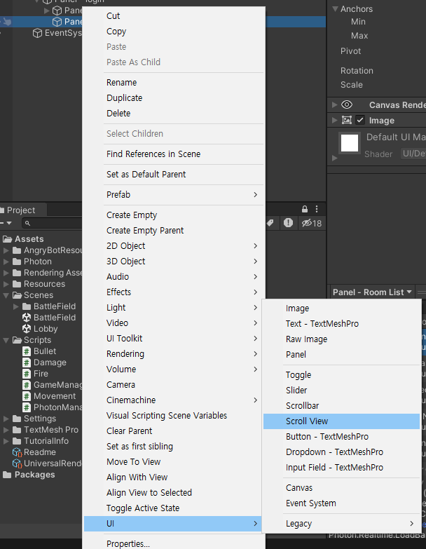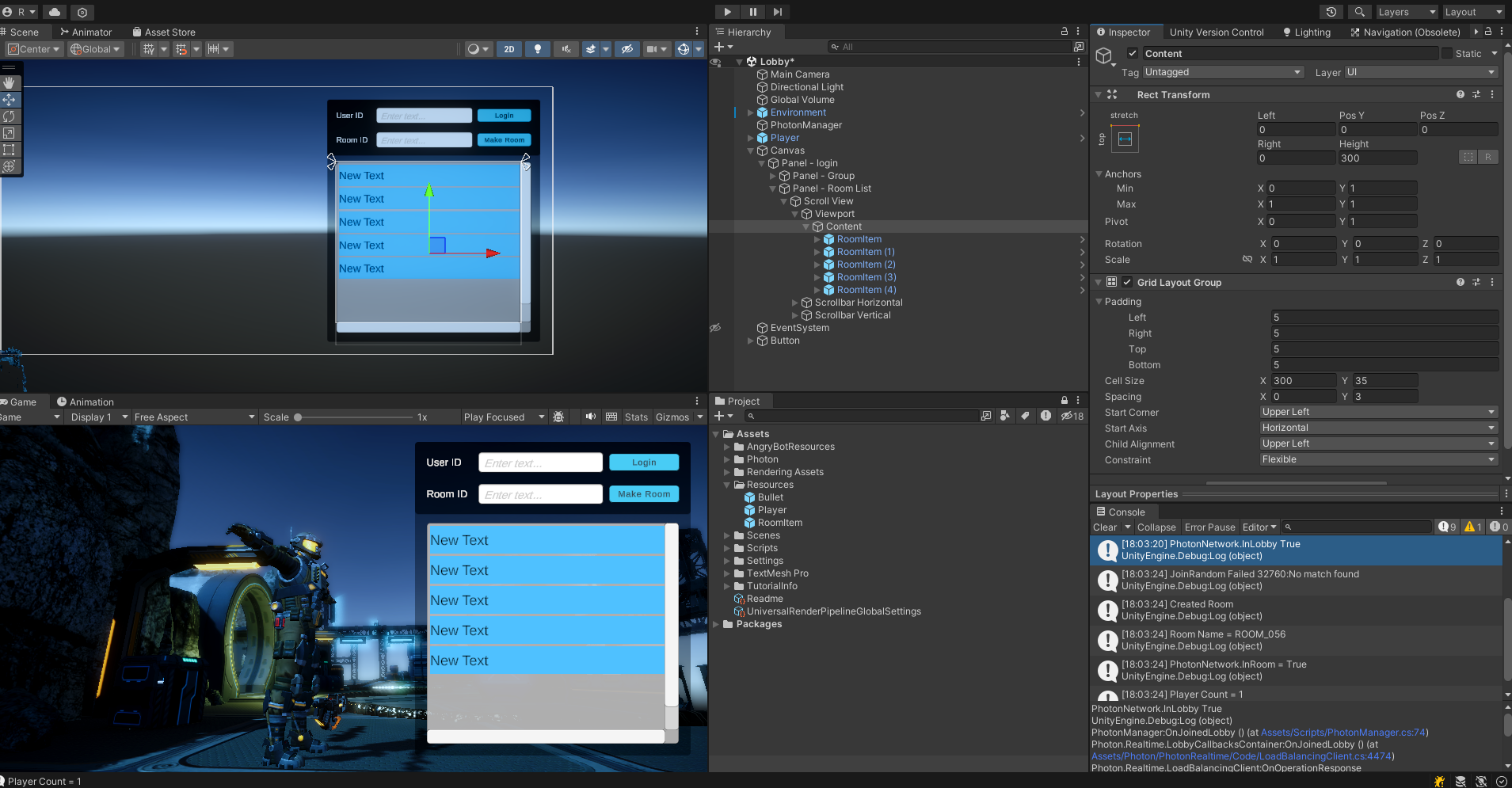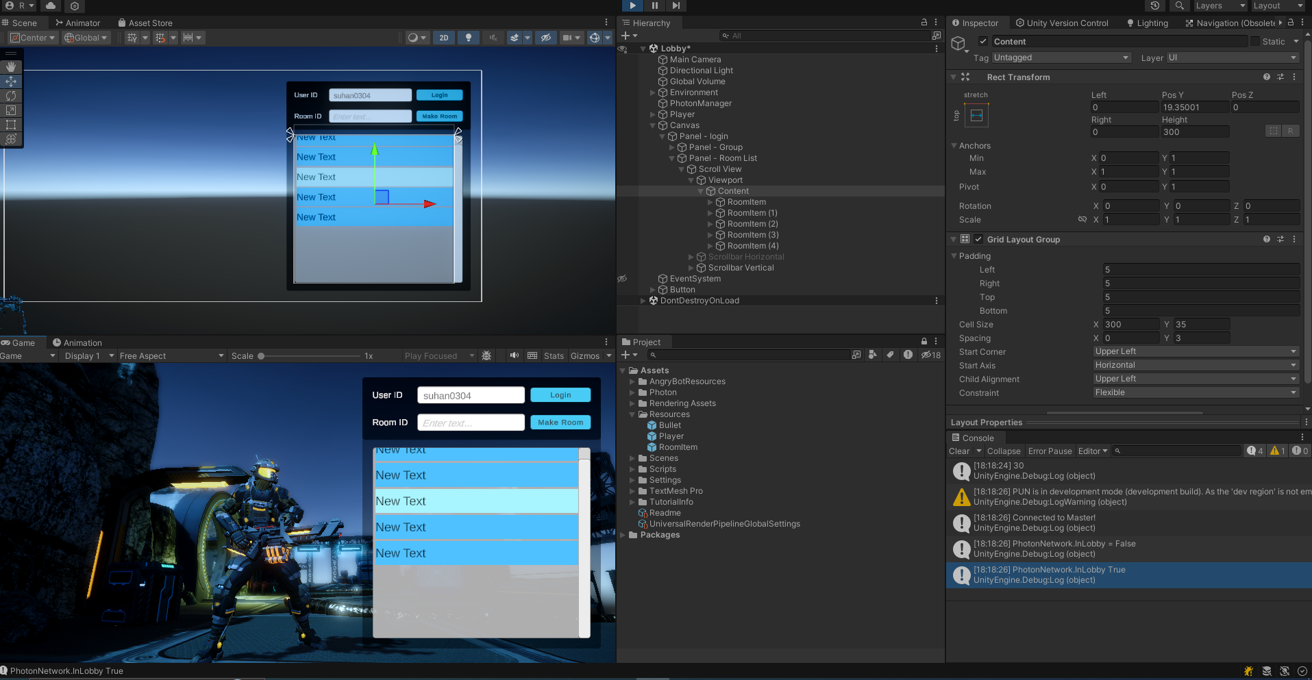 OnRoomListUpdate 함수는 RoomInfo 타입의 데이터가 List 자료형으로 넘어오고 RemovedFromList 불린 변수로 룸의 삭제 여부를 알 수 있다. 그 다음 Content를 연결해준다.