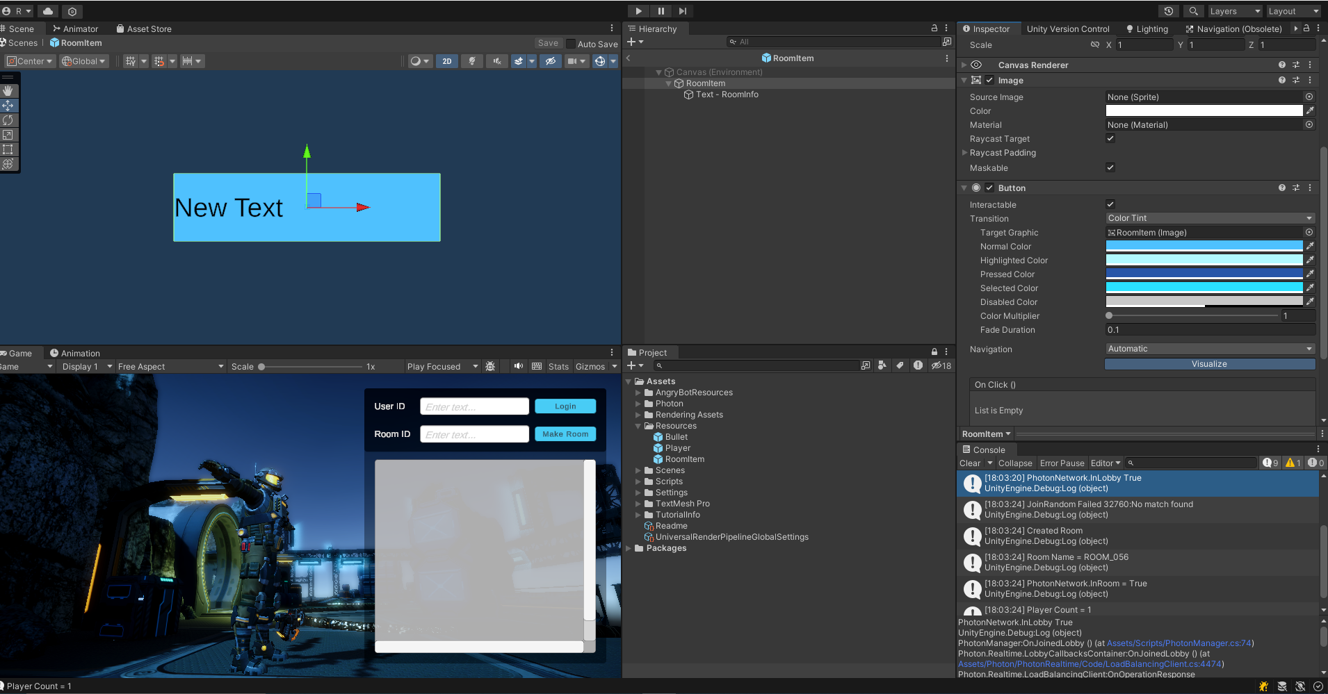 RoomData 스크립트는 OnRoomListUpdate에서 룸 정보가 갱신될 때마다 접근해 RoomInfo 데이터를 넘겨받아서 내부적으로 저장하고 하위에 있는 텍스트 UI에 룸 이름과 접속자 정보를 표시한다. 또한, 버튼을 클릭했을 때 룸에 접속하는 함수를 람다식으로 연결해뒀다.