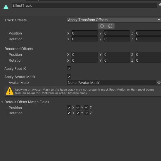 Recorded Offsets는 시작 위치에서 다시 추가적인 Offsets의 위치를 기록해놓을 수 있는 기능이다. 즉 시작 클립의 위치는 만약 Apply Transform Offsets라면 Track Offsets의 Position + Recorded Offsets 의 Position값이 된다. 우리가 만들 스킬 컷씬의 경우에는 버추얼카메라의 위치나 이펙트가 발생할 위치가 스킬 Timeline마다 다를 것이기 때문에 이 방식을 선택했다.