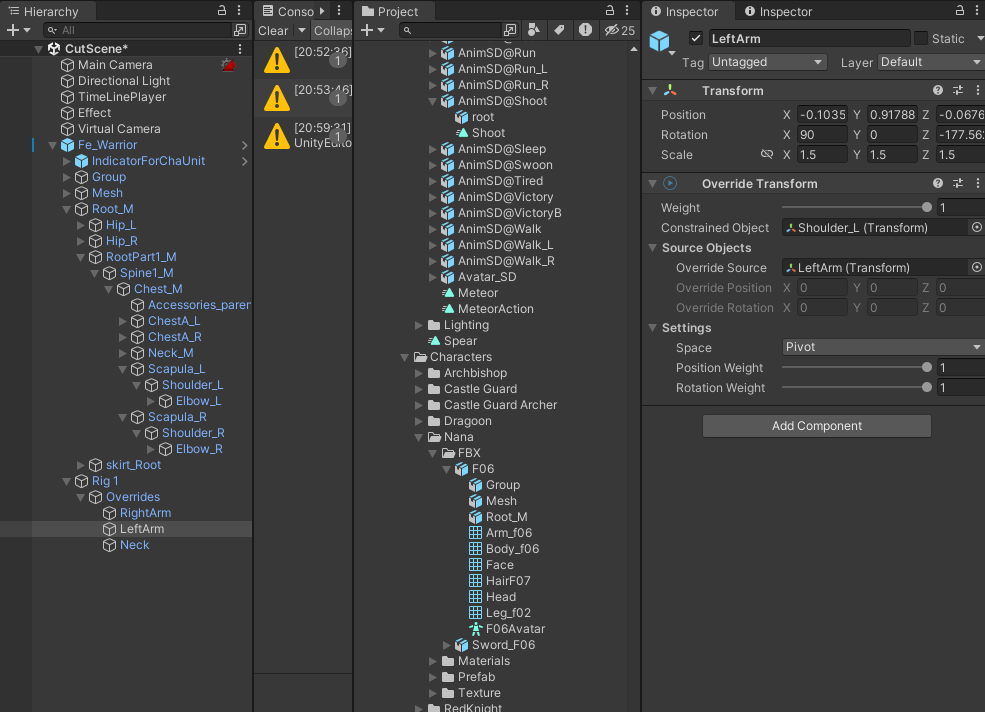 해당 빈 오브젝트들에 Override Transform 컴포넌트를 추가하고 Constrained Object와 Source Objects부분을 추가한다. 컨스트레인 오브젝트는 제어할 스켈레톤부분이고, 소스오브젝트는 빈오브젝트 자신을 추가해주면 된다.