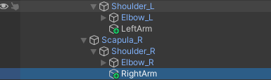 애니메이션 본의 Upper Arm 부분에 빈 자식오브젝트를 추가한다. 이때 Upper Arm부분은 스켈레톤마다 이름이 다를 수 있다.