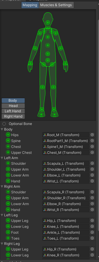 Configure버튼을 눌러서 확인해보면, 애니메이션 리깅이 어떻게 되어있는 지 한 눈에 확인할 수 있다.