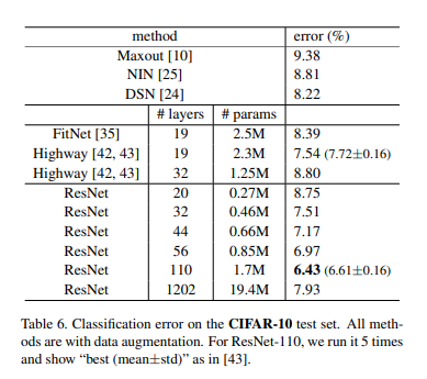 또한 본 논문에서 추가적으로 shortcut connection을 위해서 identity mapping과 projection mapping 사용시 결과를 실험을 통해 알려주고 있다.