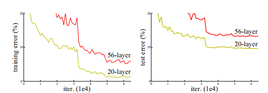 위 그림은 CIFAR-10을 사용한 plain networks의 Training/Test error이다. 더 깊은 층인 56-layer의 error rate가 더 높은 것을 볼 수 있다. 학습 자체가 잘 안되는 것이다.