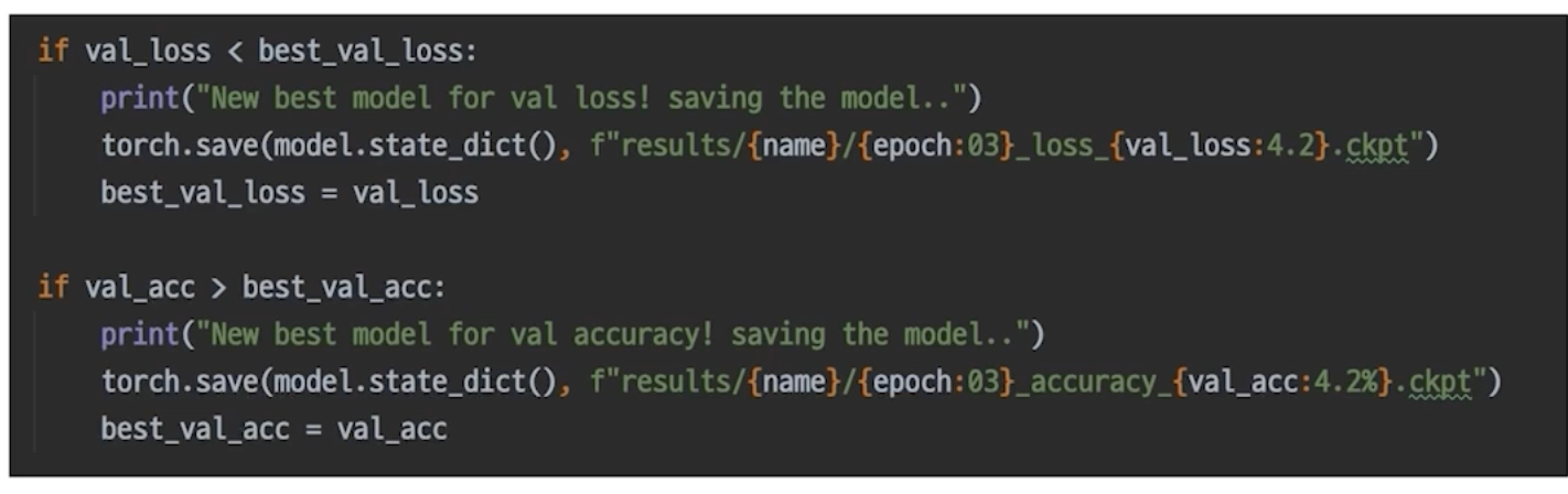 우리가 중간중간 모델의 결과를 저장하고 싶은 경우가 있습니다. 학습되는 중간에 좋은 성능의 모델이 발견이 되었으면 모델을 저장하는 것이 좋은데요. 이러한 체크포인트 저장 과정을 Evaluation에 추가해서 체크포인트 모델이 저장되도록 설계하세요.