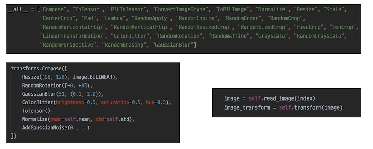 - blur, Colorjitter, Gaussian Blur, MultiplicaateNoise, CLAHE, Equalize, GlassBlur, RGBShift, ChannelDropout, FancyPCA, MedianBlur, RandomBrightnessContrast, ChannelShuffle, GaussNoise, MotionBlur, RandomFog 등