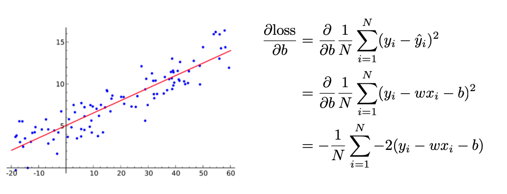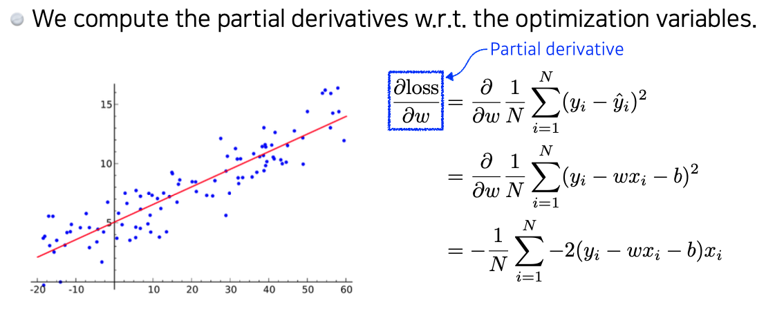 - 여기에서는 파라미터가 W, b 두 개이므로 두 개에 대해 각각 편미분한다.