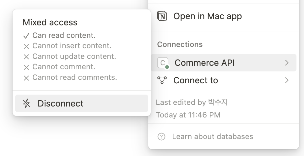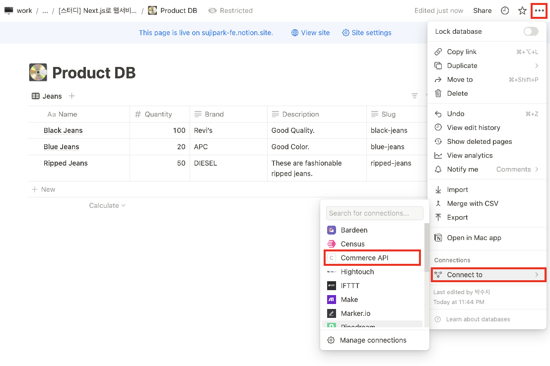노션 DB 페이지 - 우측 상단 … 메뉴 - Connect to - 연결할 API 이름