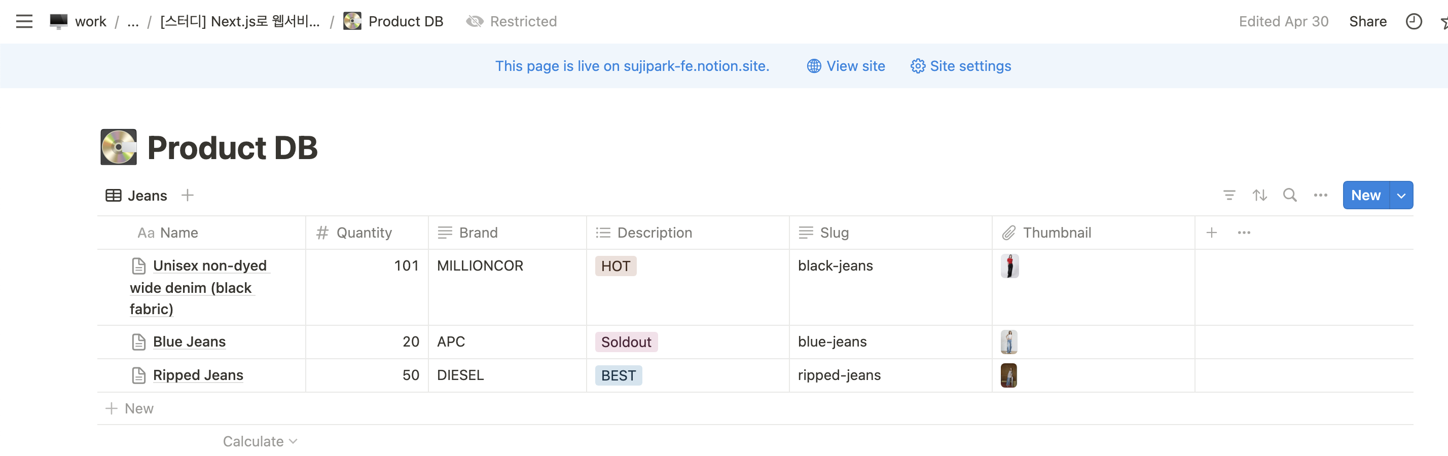 페이지를 만들고 테이블을 추가해 데이터를 입력해 줍니다. (Notion DB 페이지 경로)